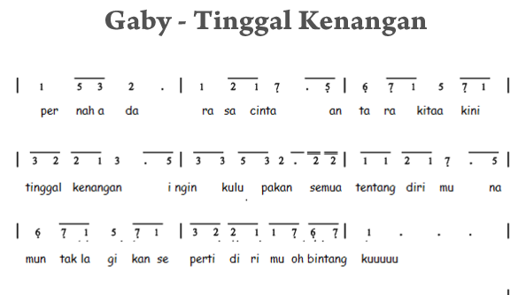 Not Lagu Tinggal Kenangan - WebTinggal Kenangan - Gaby. Written By Tri Matkusrin Tuesday, 19 September 2017. Not Angka Pianika Lagu Tinggal Kenangan Gaby - Buat kalian yang Hobi Bermain. WebNot Angka Lagu: Gaby - Tinggal Kenangan. 1 5 3 2 . . 1 2 1 7_ Pernah ada.. rasa cinta.. 5_ 6_ 7_ 1 5_ . 1 1 3 2 2 1 2 antara kita, kini tinggal kenangan 5_ 3 3 5 3 2 . ..
